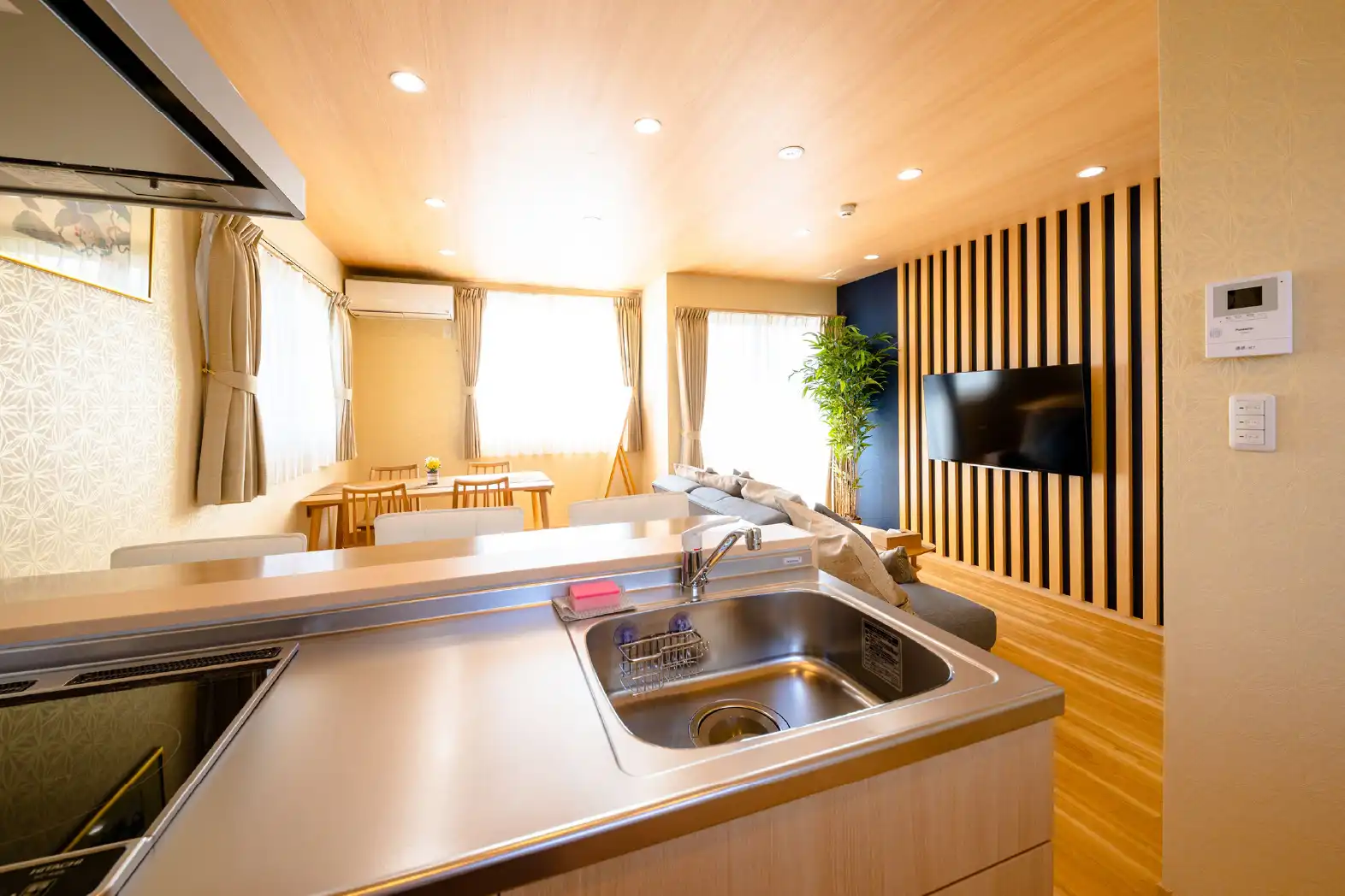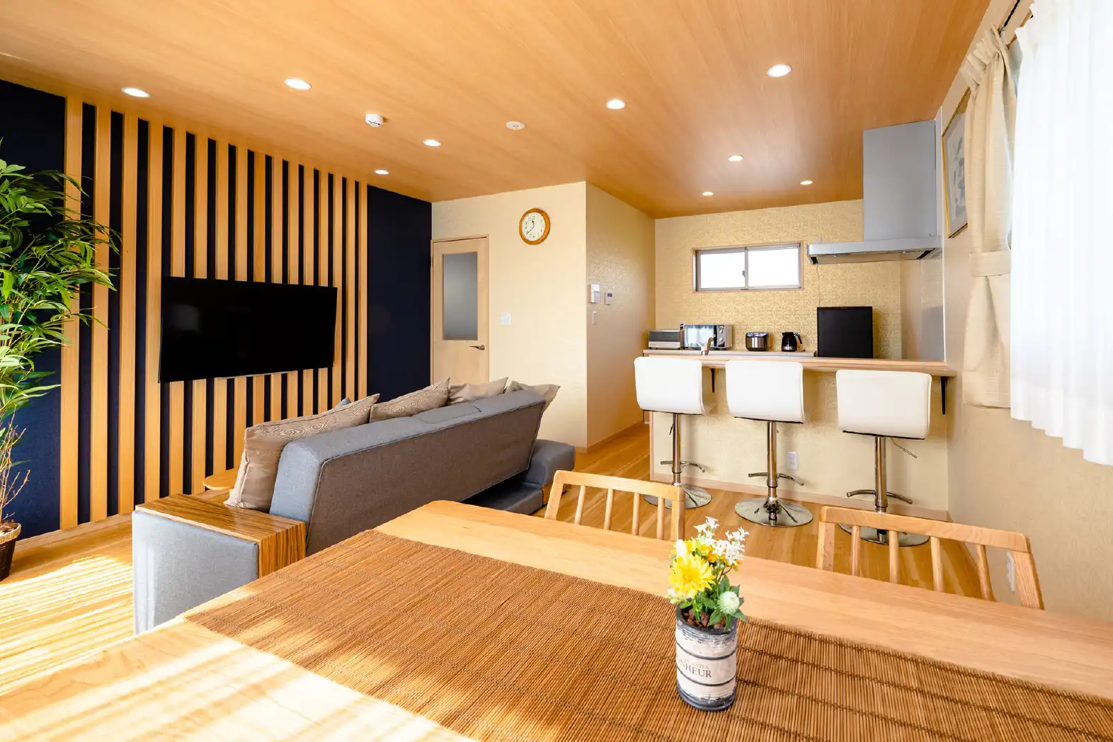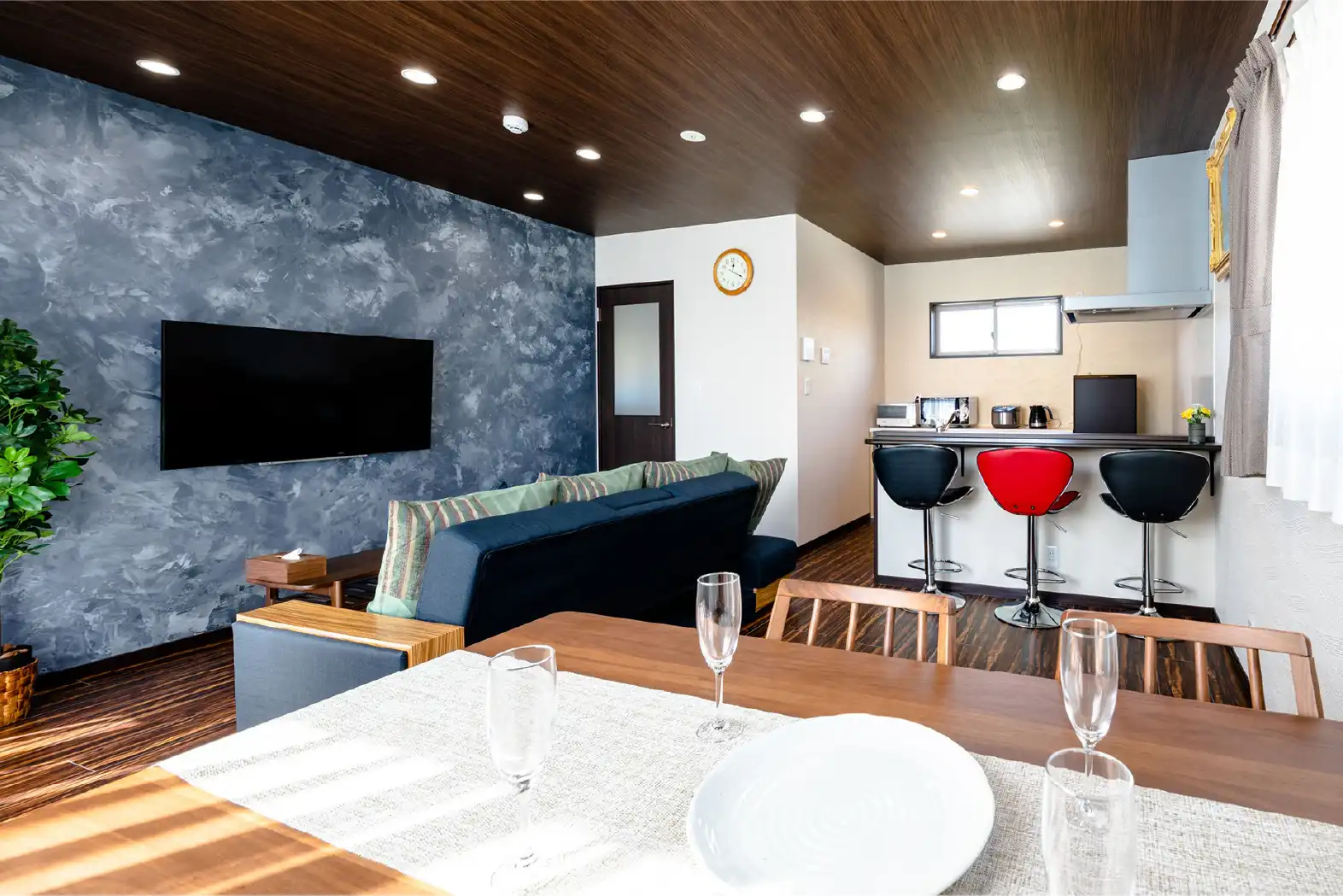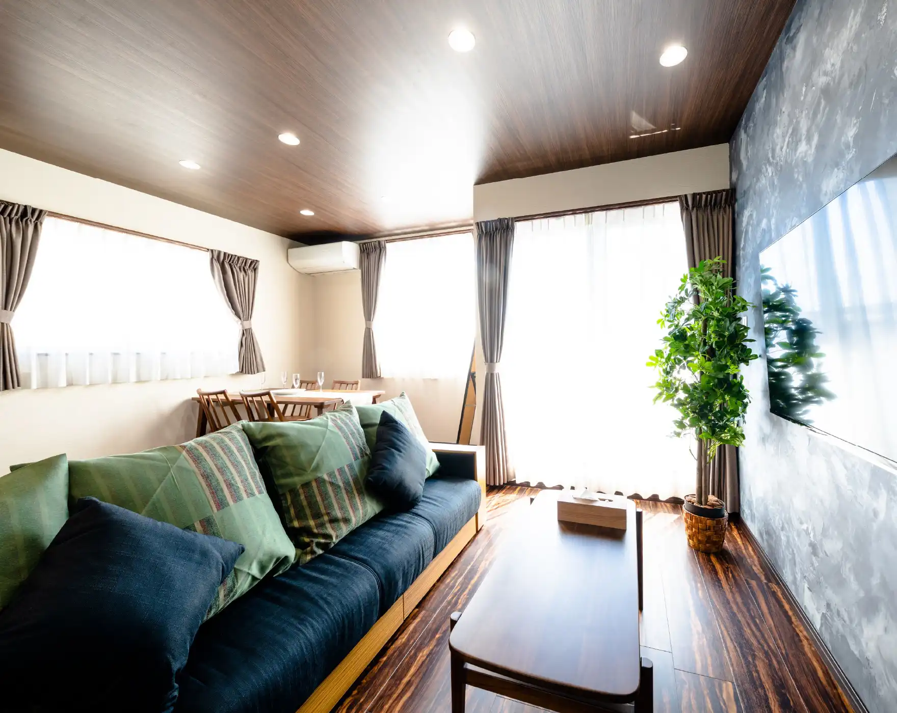 “和(Japanese Style)”を感じられるような宿泊体験をご提供すべくプロデュースした「-雅MIYABI-」は、⽊々の温かみある⾵合いを引き出した和モダンなしつらえに。リビング(共有スペース)の壁掛けテレビ背景には⽩⽊の柱を並べ、壁紙は和紙調に統⼀。建具・座布団・エントランスのインテリアを含め、そこかしこに和の雅(みやび)と静けさを感じる⾮⽇常空間としながら、ベッドやソファといった機能⾯は「洋」で統⼀して、各国から訪⽇するお客さまにも安⼼してご利⽤いただける施設としております。