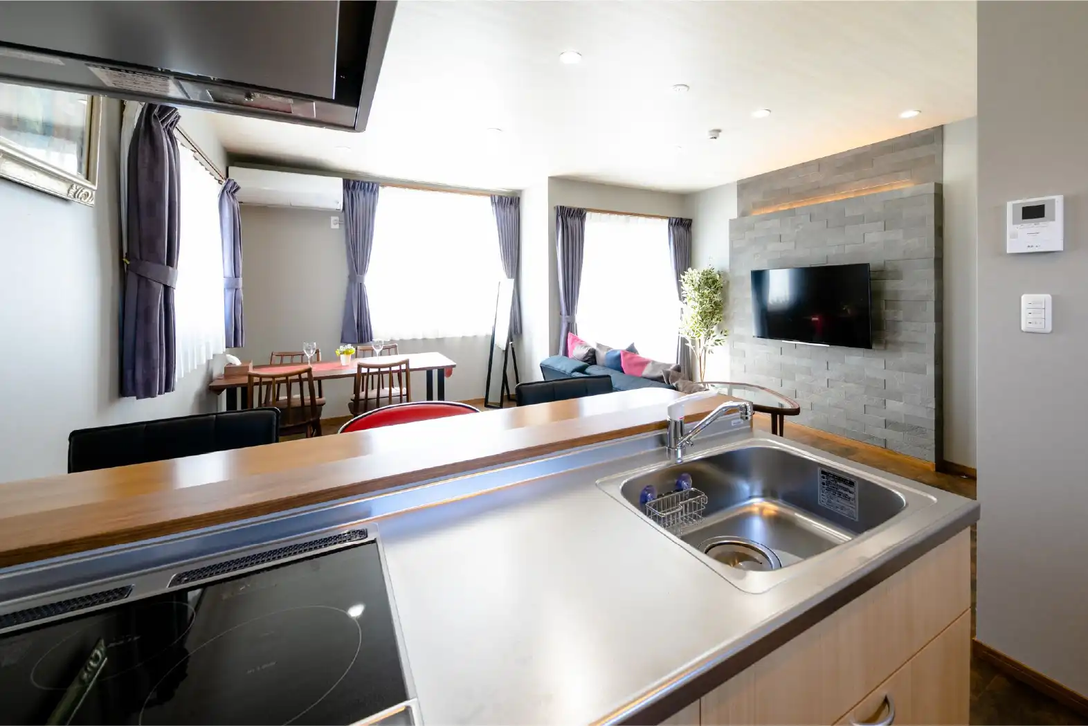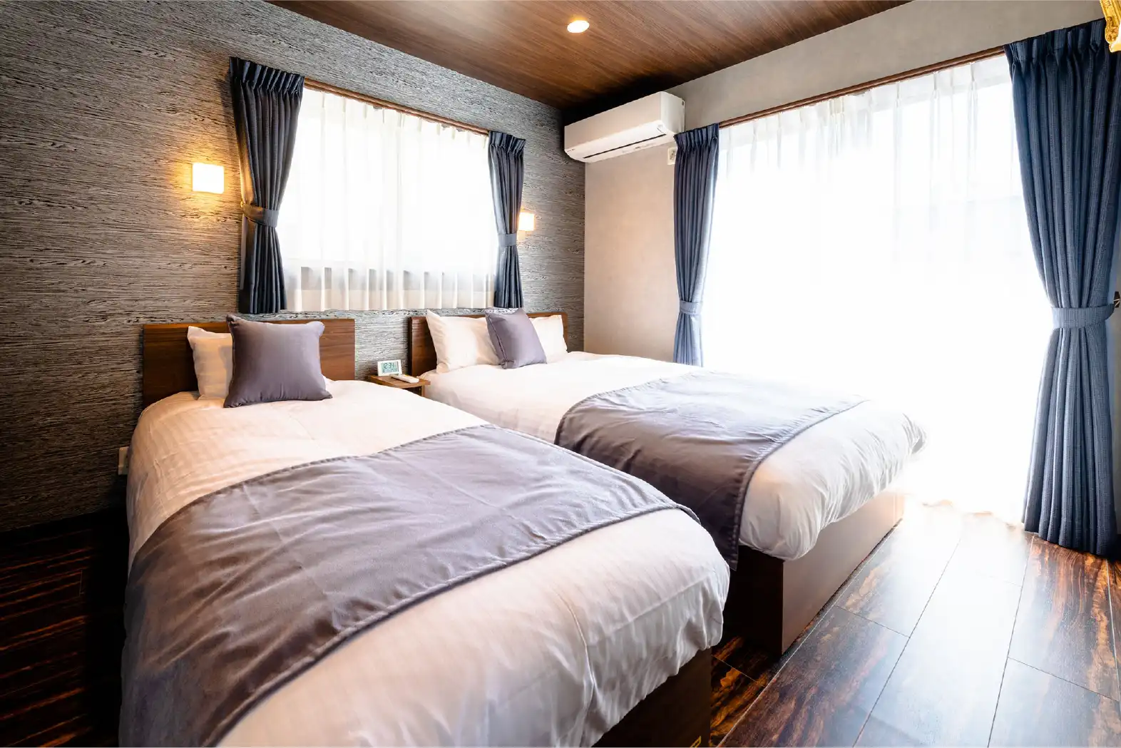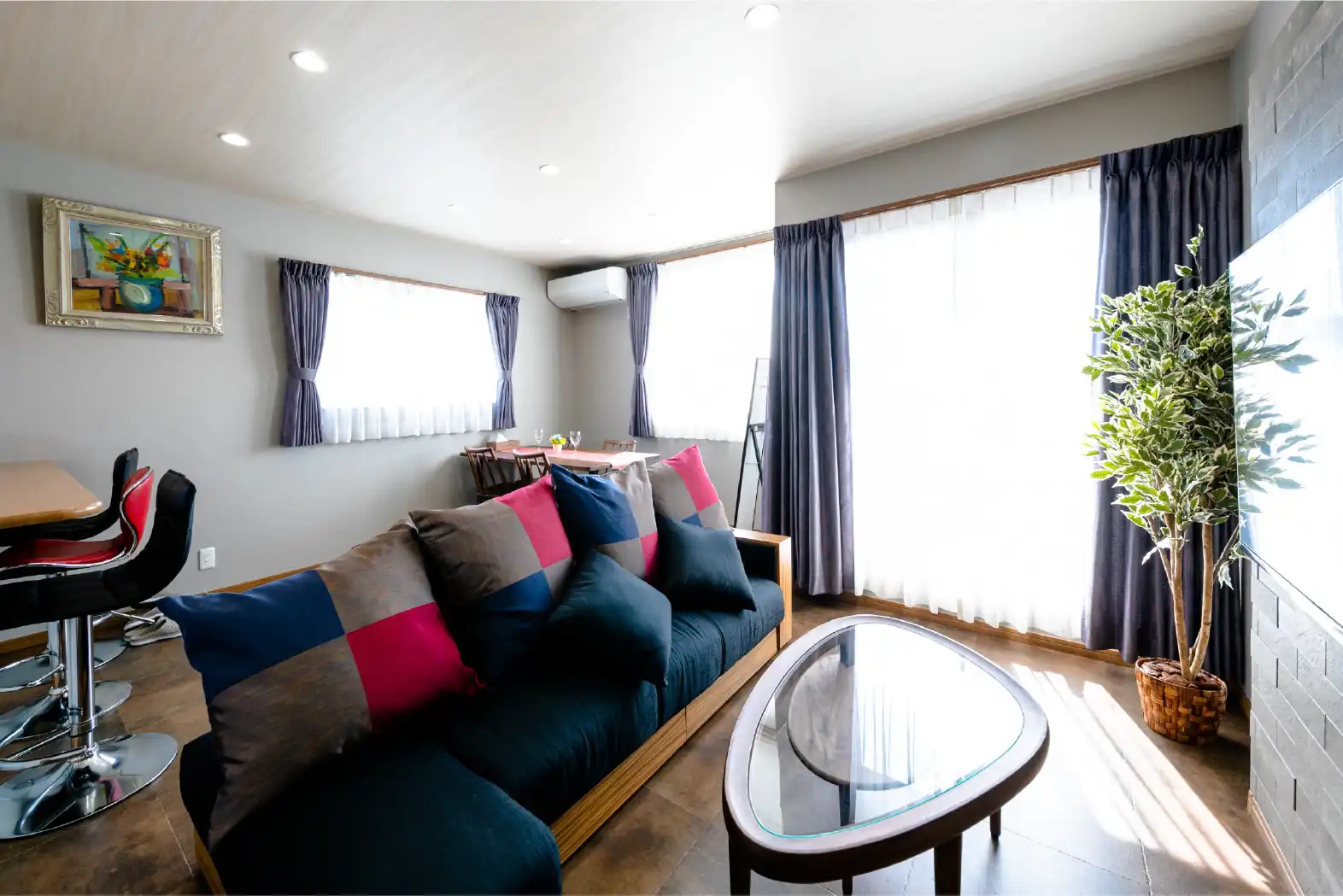 “和(Japanese Style)”を感じられるような宿泊体験をご提供すべくプロデュースした「-雅MIYABI-」は、⽊々の温かみある⾵合いを引き出した和モダンなしつらえに。リビング(共有スペース)の壁掛けテレビ背景には⽩⽊の柱を並べ、壁紙は和紙調に統⼀。建具・座布団・エントランスのインテリアを含め、そこかしこに和の雅(みやび)と静けさを感じる⾮⽇常空間としながら、ベッドやソファといった機能⾯は「洋」で統⼀して、各国から訪⽇するお客さまにも安⼼してご利⽤いただける施設としております。