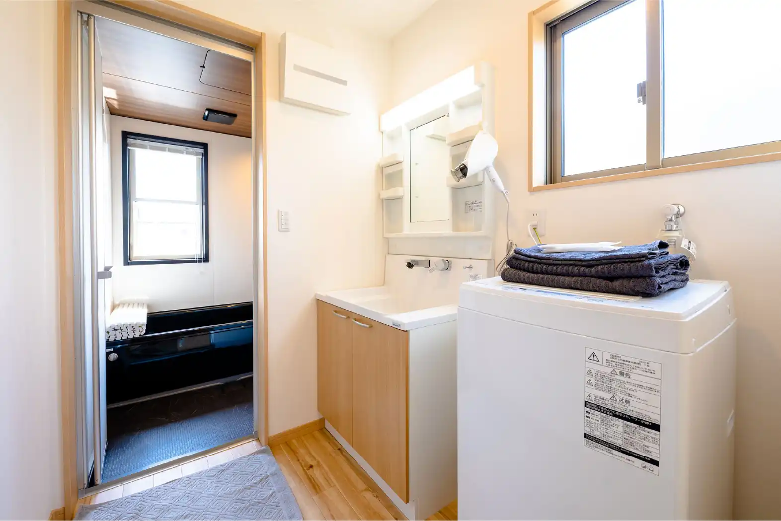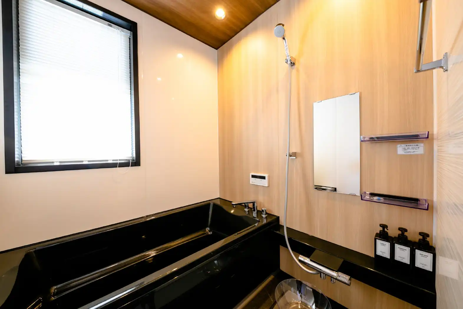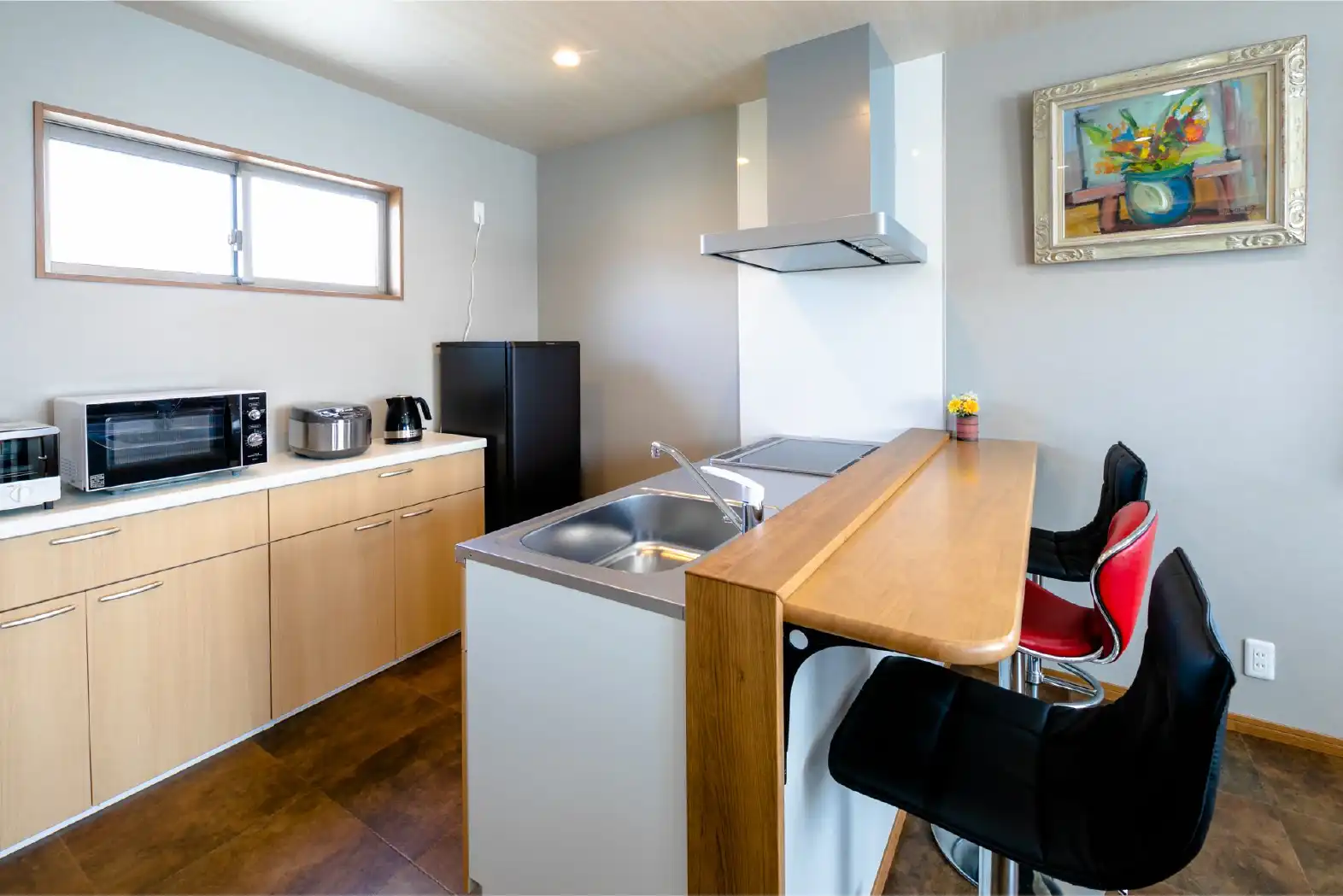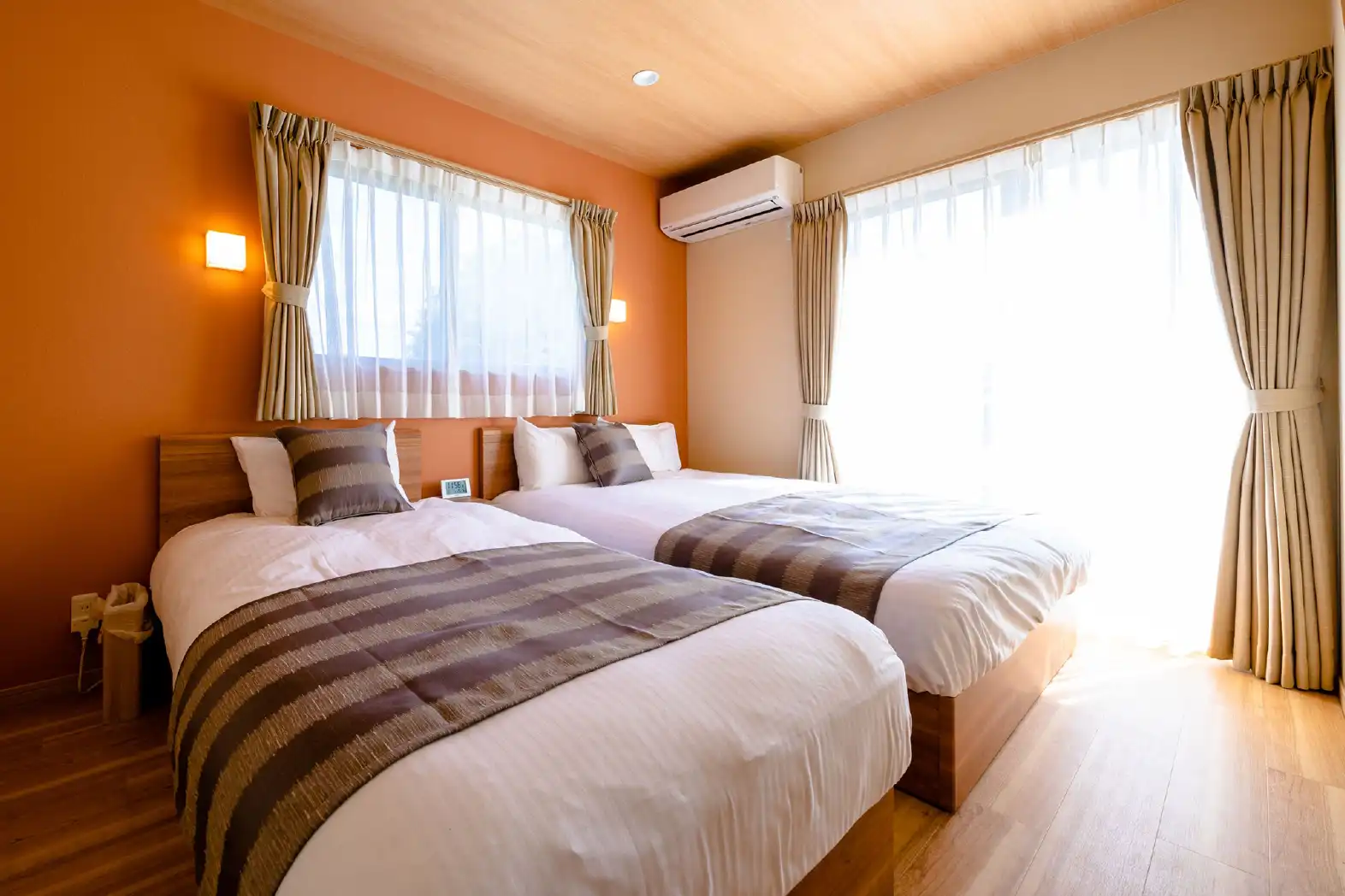 “和(Japanese Style)”を感じられるような宿泊体験をご提供すべくプロデュースした「-雅MIYABI-」は、⽊々の温かみある⾵合いを引き出した和モダンなしつらえに。リビング(共有スペース)の壁掛けテレビ背景には⽩⽊の柱を並べ、壁紙は和紙調に統⼀。建具・座布団・エントランスのインテリアを含め、そこかしこに和の雅(みやび)と静けさを感じる⾮⽇常空間としながら、ベッドやソファといった機能⾯は「洋」で統⼀して、各国から訪⽇するお客さまにも安⼼してご利⽤いただける施設としております。