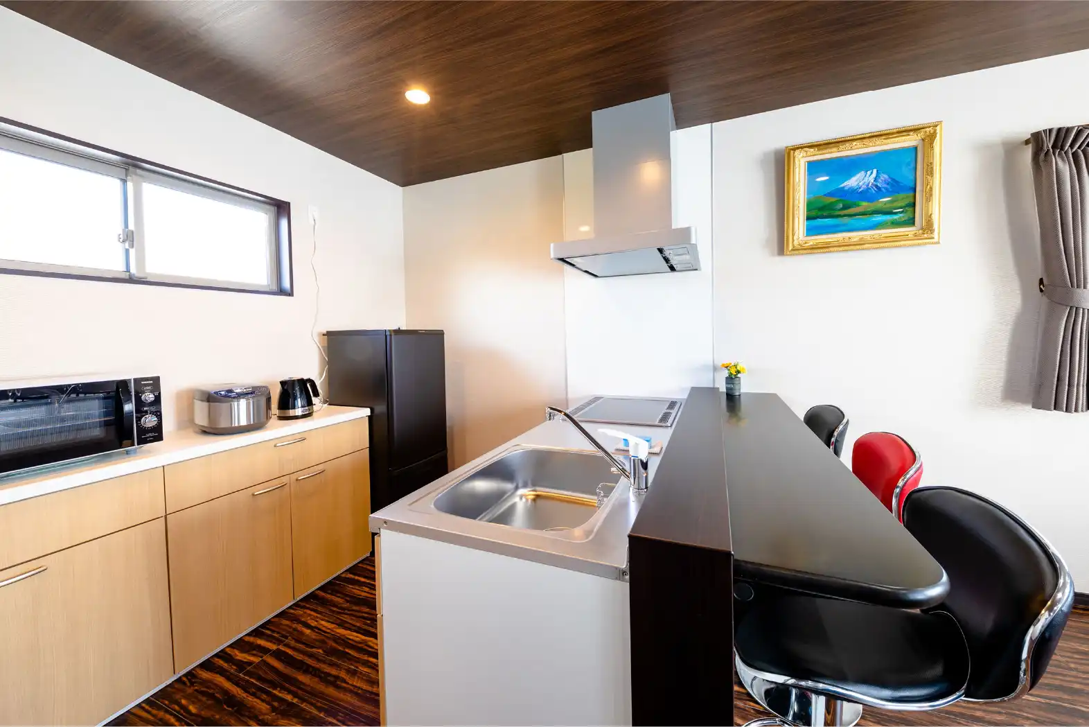 ⽇本的な美を象徴する霊峰・富⼠をモチーフにつくられたヴィラが「-錦NISHIKI-」です。⽷⾊で美しい模様を織り込む絹織物「錦」のように、季節・時間・空模様など、さまざまな要素が絡み合うことで無数の表情を⾒せる富⼠の⼭肌をイメージした内装が特徴。全体を落ち着いた⾊合いでまとめて、ご家族連れや海外のお客さまもリラックスできる空間に仕上げました。各セクションでは富⼠を描いた油絵やインテリアがお客さまをおもてなし致します。